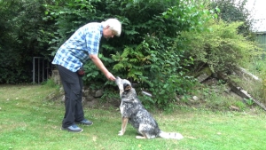 Jullie zijn een soort ja-knikker: komt de hond omhoog, gaat jouw arm omhoog. Gaat de hond omlaag, gaat jouw arm omlaag. Het is niet perse noodzakelijk dat de hond hierbij zit. Hij kan ook staan.
