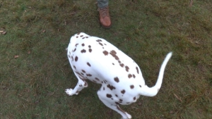 2) Je start met enige snelheid, ook in je stem, om aan te sluiten bij het niveau van opwinding van de hond. Met elke cirkelvormige beweging wordt jij rustiger in stem en gebaar zodat de opwinding bij de hond af kan nemen.